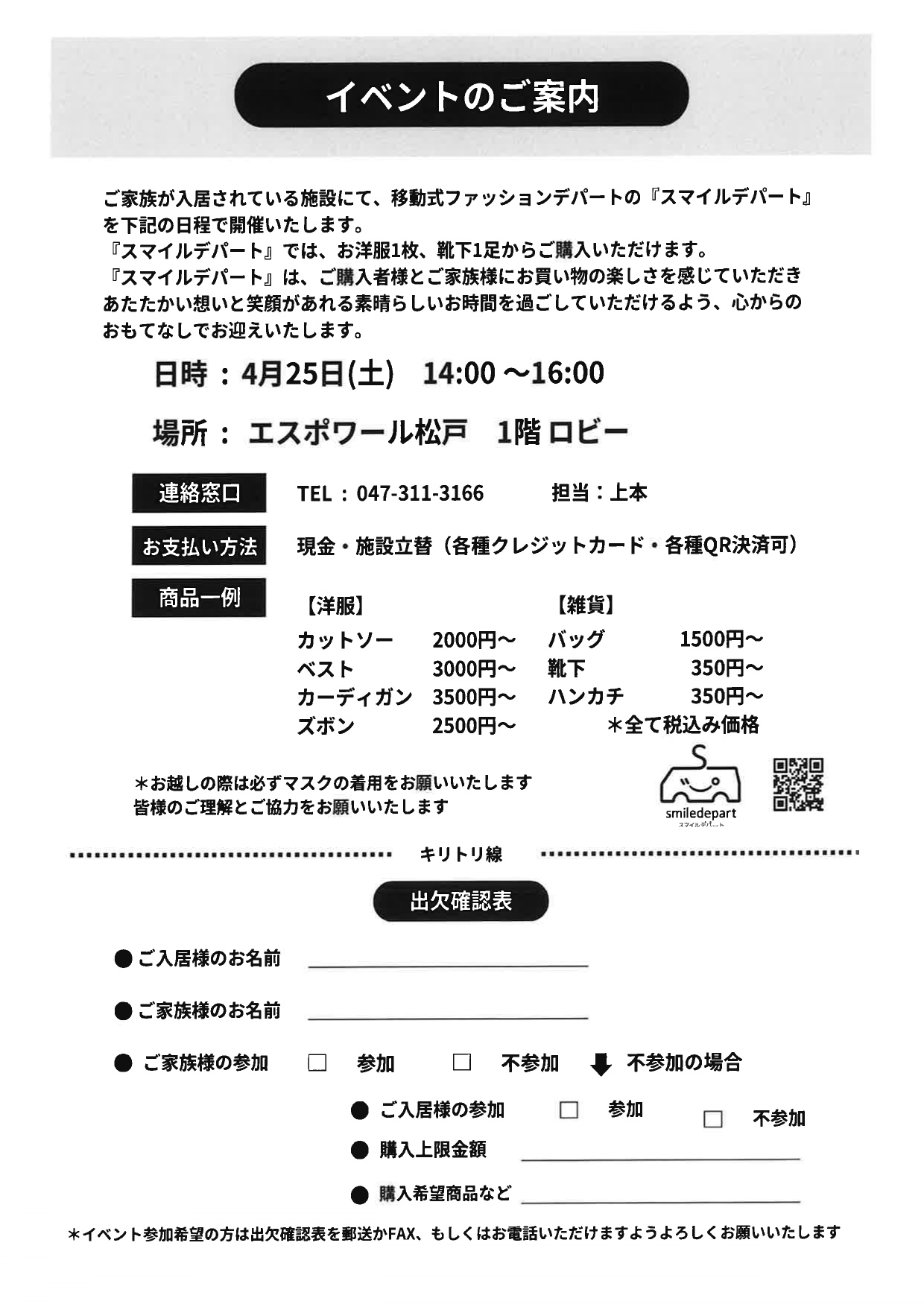 エスポワール松戸1Fエントランスにて洋服の移動販売を行います。洋服だけでなく、ハンカチなどの小物や日用品などを豊富に取り揃え、お手頃な価格でご提供いたします。コロナ以降、ご家族様との外出が出来ない現状が続いています。せめて施設内でゆっくりとお買い物を楽しんでいただき、また、イベントの一環として施設ご利用者様同士のコミュニケーションの場としてご利用いただけたらと思います。